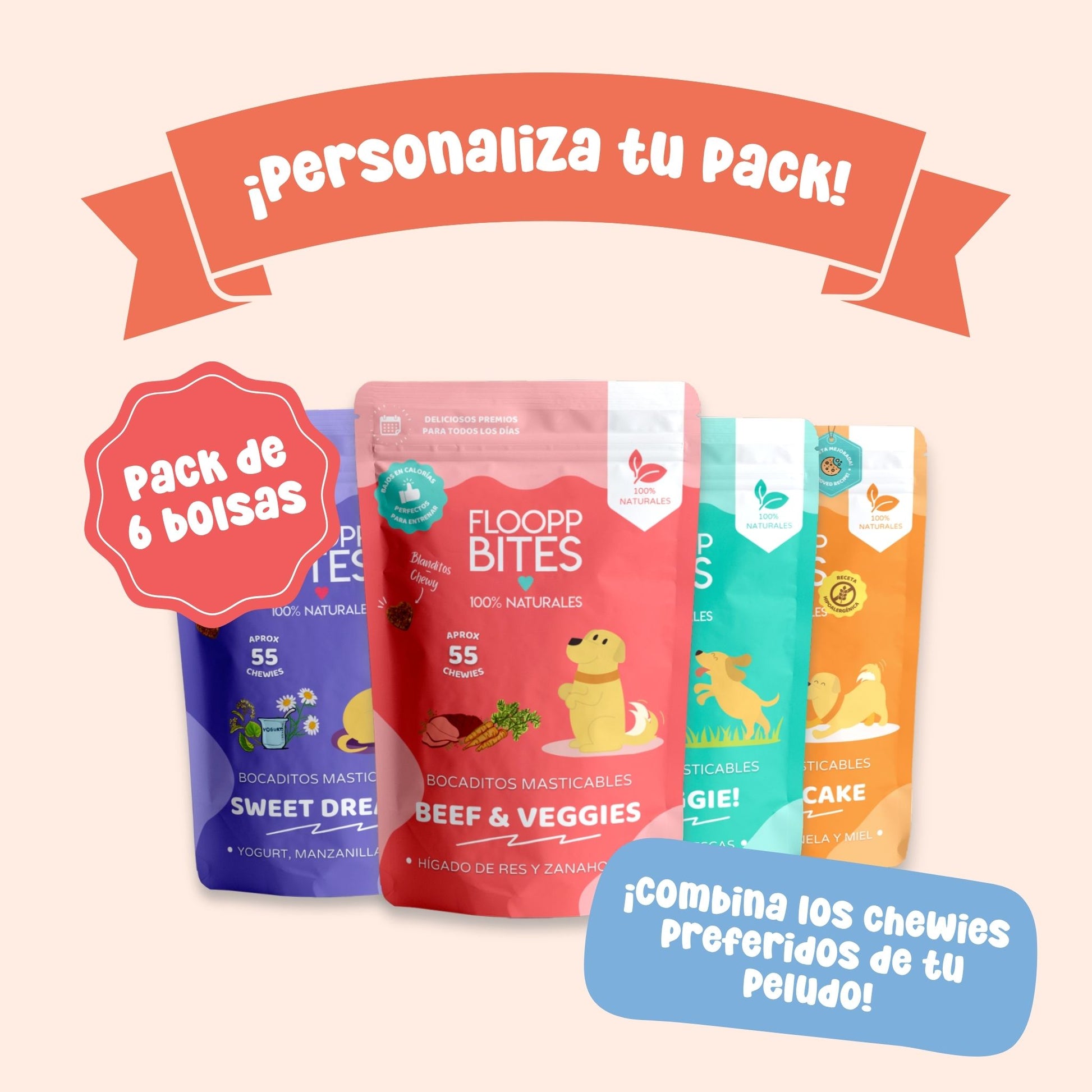¡Crea el Chewy Pack personalizado perfecto para tu perro eligiendo sólo sus snacks favoritos! Selecciona y combina 6 bolsitas de chewies naturales, repitiendo o variando los sabores que más le gustan a tu mascota.