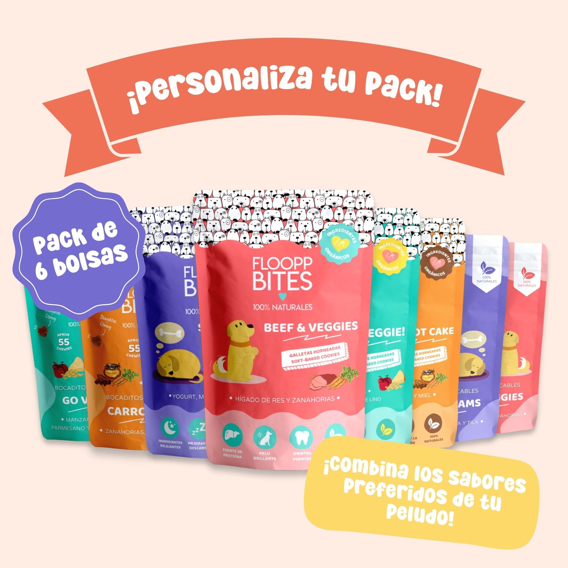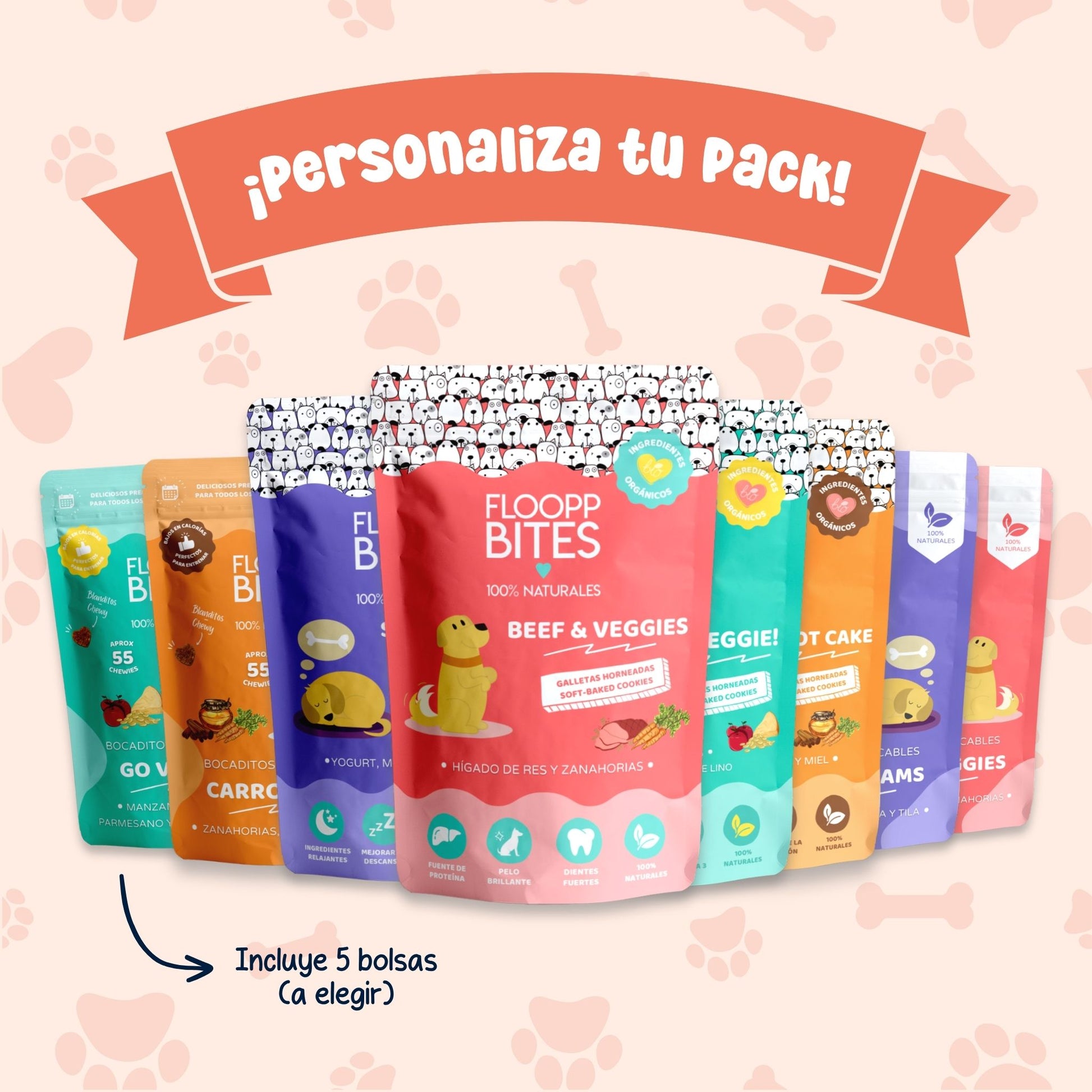 ¡Diseña su propio pack de snacks! Con este pack personalizado, puedes elegir y combinar hasta 5 bolsitas de Floopps: 3 bolsas de deliciosos chewies y 2 de galletas, creando la combinación perfecta para tu peludo.